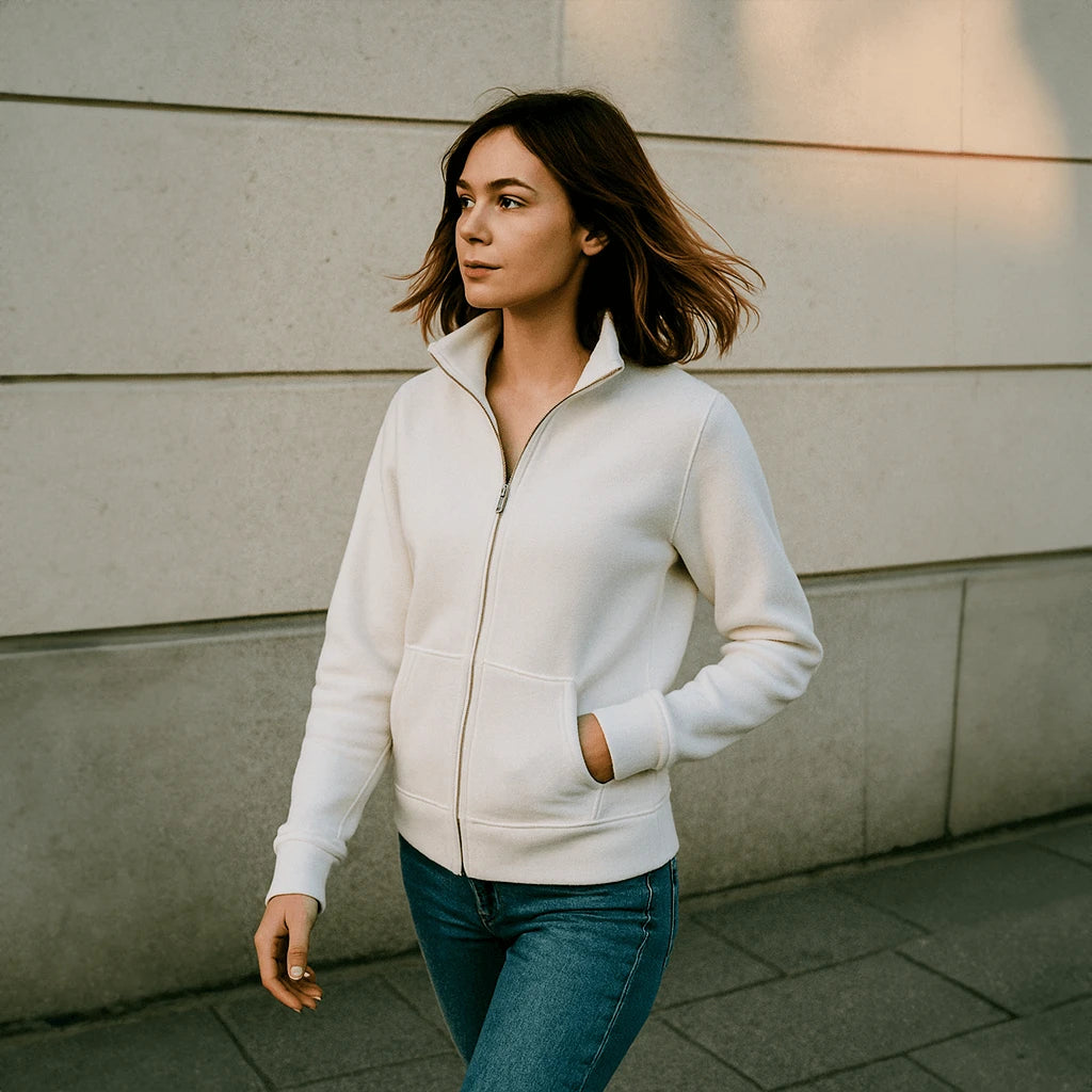 La cerniera coperta assicura una superficie liscia per una personalizzazione impeccabile, mentre il collo a tartaruga con fettuccia interna in single jersey aggiunge comfort e stabilità.